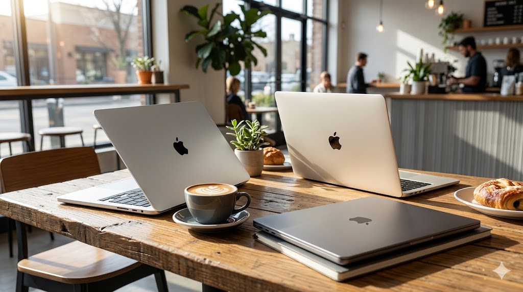 MacBook Air er tynnere, lettere og har et vifteløst design, noe som gjør den helt stillegående. MacBook Pro har kraftigere prosessorer med aktive vifter, bedre skjermer (XDR) og flere porter, men er tyngre og dyrere. Air er best for mobilitet, Pro er best for tunge profesjonelle oppgaver.